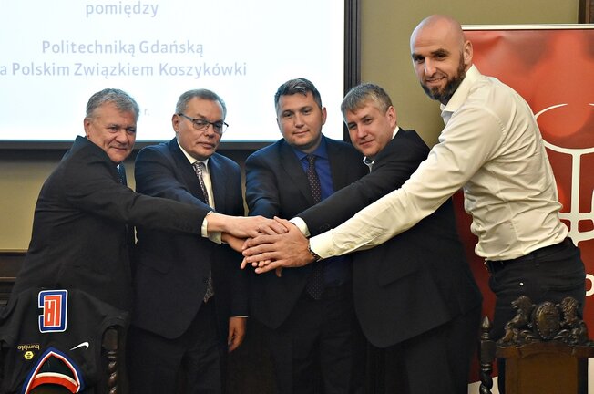 W podpisaniu listu intencyjnego uczestniczyli (na zdjęciu) Krzysztof Kaszuba, dyrektor Centrum Sportu Akademickiego PG, prof. Piotr Dominiak, prezes Radosław Piesiewicz, Marcin Korpolewski, wiceprezes Zarządu Pomorskiego Okręgowego Związku Koszykówki, i Marcin Gortat.