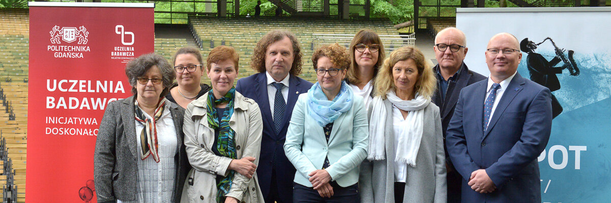 Na zdj. W pierwszym rzędzie od prawej: prof. Krzysztof Wilde, rektor Politechniki Gdańskiej, prof. Lucyna Nyka, dziekan Wydziału Architektury PG, Magdalena Czarzyńska-Jachim, wiceprezydent Sopotu, dr inż. arch. Magdalena Podwojewska, prodziekan ds. studentów i promocji WA PG, dr inż. arch. Anna Wancław, prodziekan ds. kształcenia i programów studiów WA PG. W drugim rzędzie od prawej: mgr inż. arch. Jacek Droszcz, WA PG, Beata Majka, dyrektor artystyczna Bałtyckiej Agencji Artystycznej BART, Jacek Karnowski, prezydent Sopotu, dr inż. arch. Agnieszka Gębczyńska-Janowicz, WA PG, sekretarz konkursu. Fot. Krzysztof Krzempek/Politechnika Gdańska