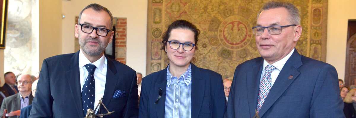 Na zdjęciu prof. Piotr Dominak (z lewej) i prof. Piotr Stepnowski z Aleksandrą Dulkiewicz, prezydent Gdańska podczas uroczystości wręczenia nagrody.