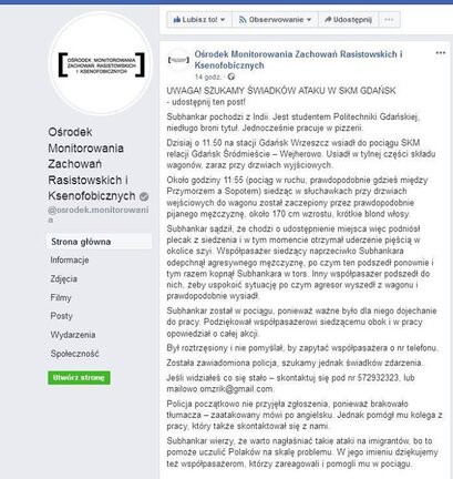 W odpowiedzi na apel Ośrodka Monitorowania Zachowań Rasistowskich i Ksenofobicznych oraz Gdańskiego Centrum Równego Traktowania udostępniamy informację o poszukiwaniu świadków tego zdarzenia.