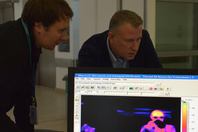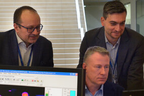 Na zdj. Arkadiusz Lendzion, z-ca dyrektora naczelnego UCK ds. administracyjno-technicznych, lek. Adam Sudoł, z-ca dyrektora naczelnego UCK ds. logistyki medycznej. Przy laptopie prof. Mariusz Kaczmarek z Politechniki Gdańskiej